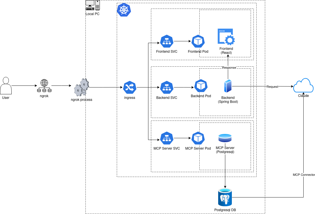 주요 기술 스택 : react, spring boot, postgresql, claude ai, claude mcp connector, k3s